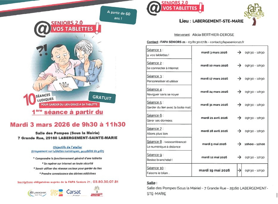 1ère séance à partir du mardi 3 mars 2026 de 9h30 à 11h30